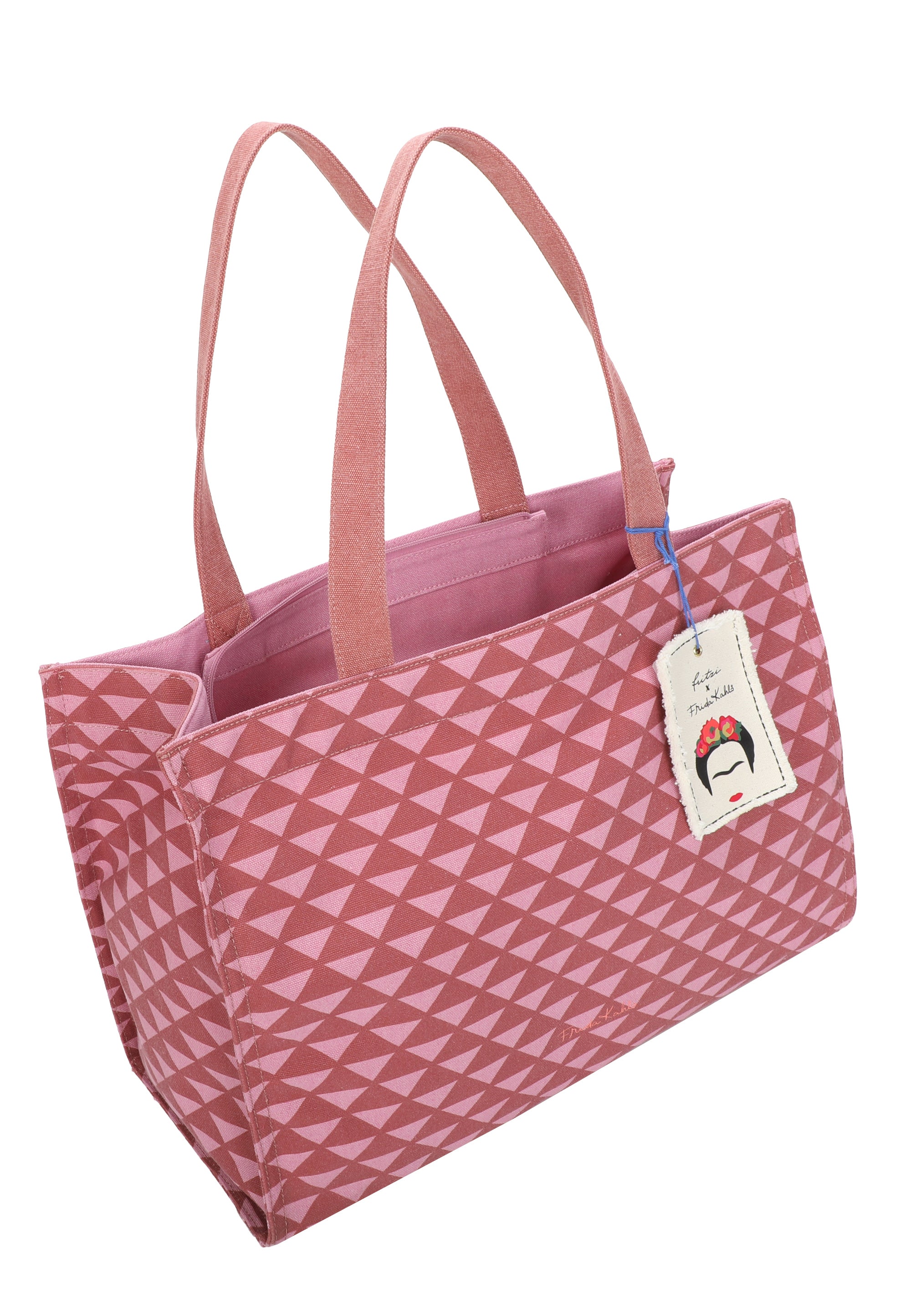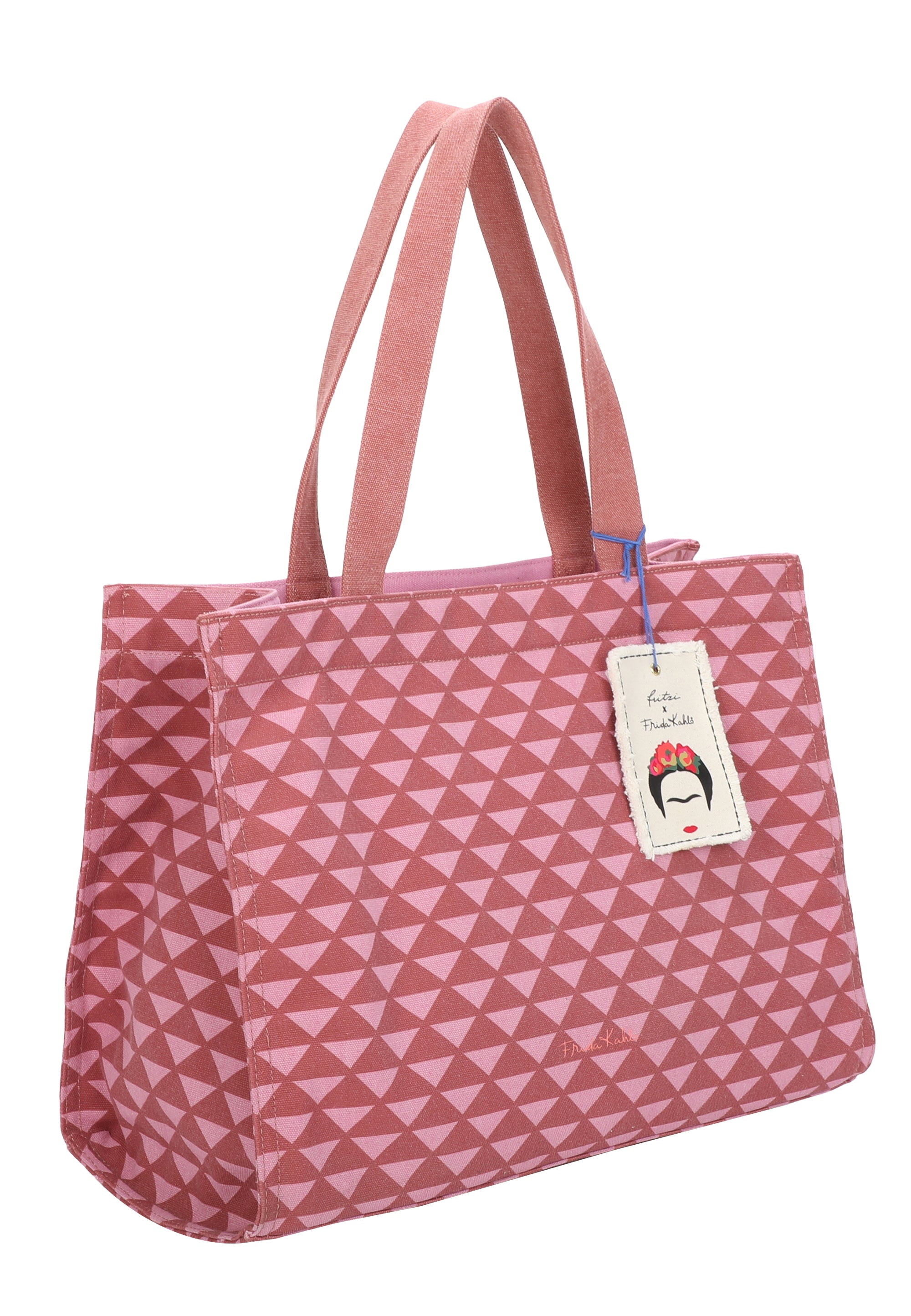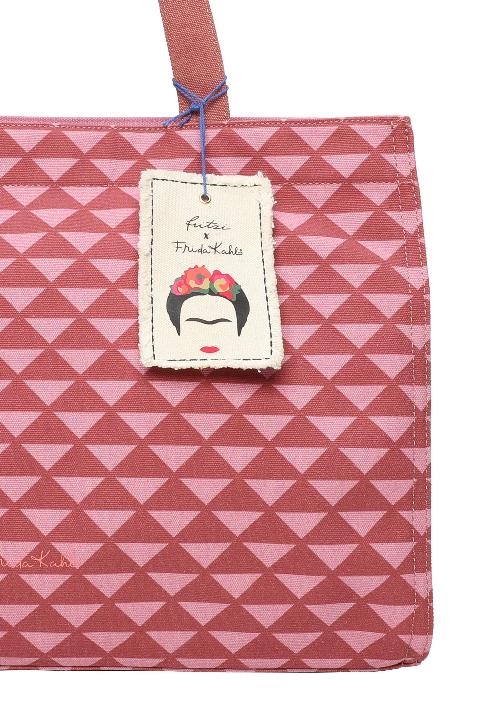 Dieser Style in rougher Canvas Qualität mit wunderschönem, grafischem All-Over-Print ist mit seinem tollen Füllvolumen ein praktischer wie auch bezaubernder Begleiter in deinem Alltag. Abgerundet wird der Style mit einem schönen, handwerklichen Canvas-Anhänger mit aufgedruckter Frida Kahlo Kopf-Illustration – viel zu schade zum Abnehmen.