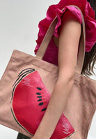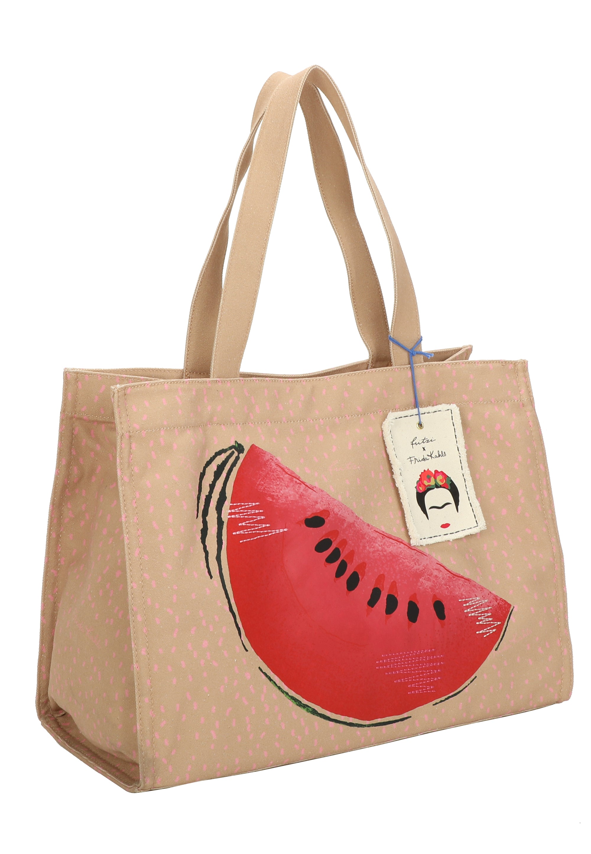Dieser Style in rougher Canvas Qualität mit wunderschönem, femininen All-Over-Print und dekorativem Melonen-Aufdruck mit Stick-Details ist mit seinem tollen Füllvolumen ein praktischer wie auch bezaubernder Begleiter in deinem Alltag. Abgerundet wird der Style mit einem schönen, handwerklichen Canvas-Anhänger mit aufgedruckter Frida Kahlo Kopf-Illustration – viel zu schade zum Abnehmen.