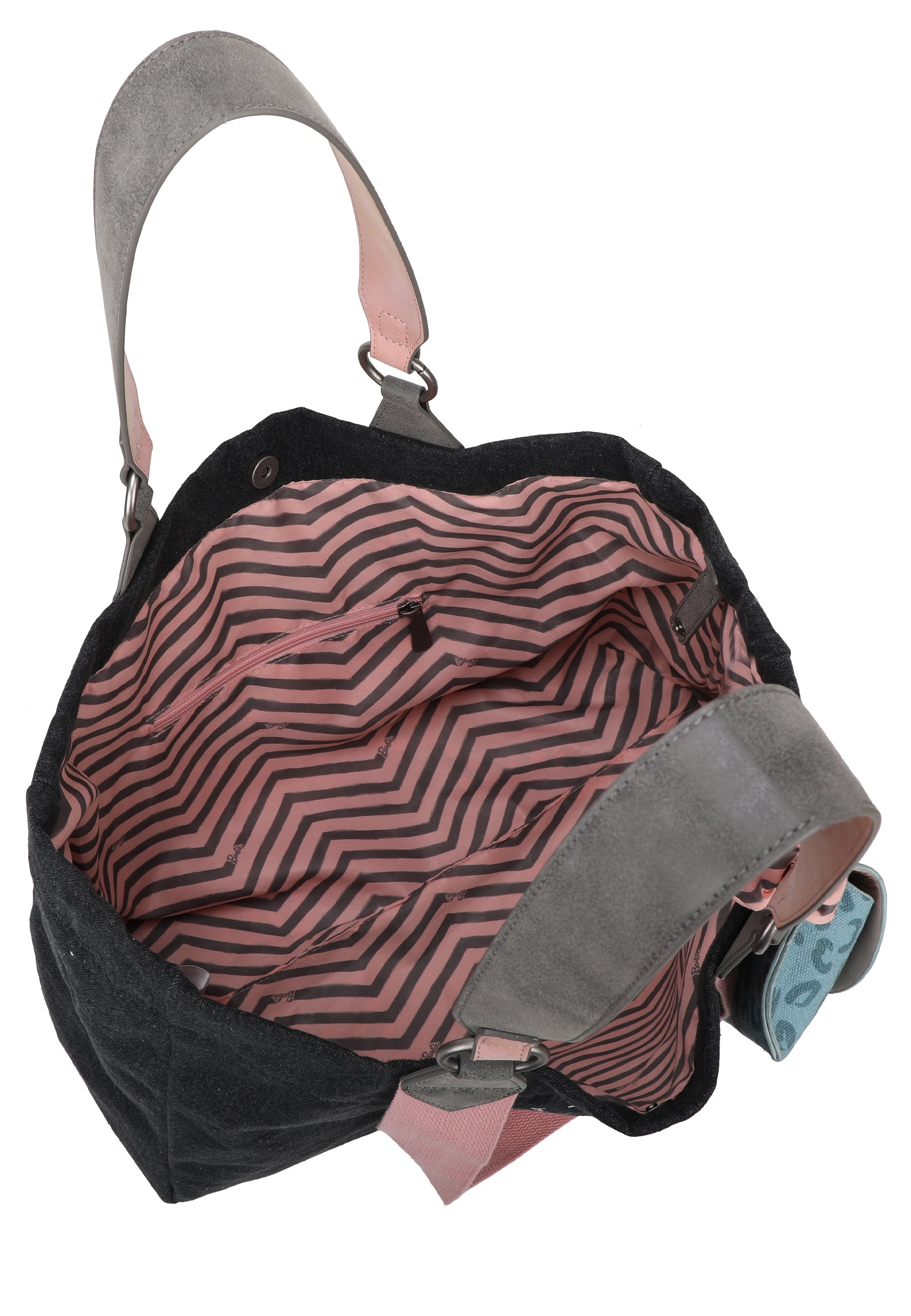 Im Inneren verzaubert der Style mit einem Zickzack-Muster und vielen, kleinen, gedruckten Barbie Logos. Ein praktisches Reißverschlussfach im Futter schafft eine gute Organisation. Das Hauptfach der Tasche verfügt über ein großes Füllvolumen und lässt sich ganz entspannt mit einem Druckknopf schließen.
