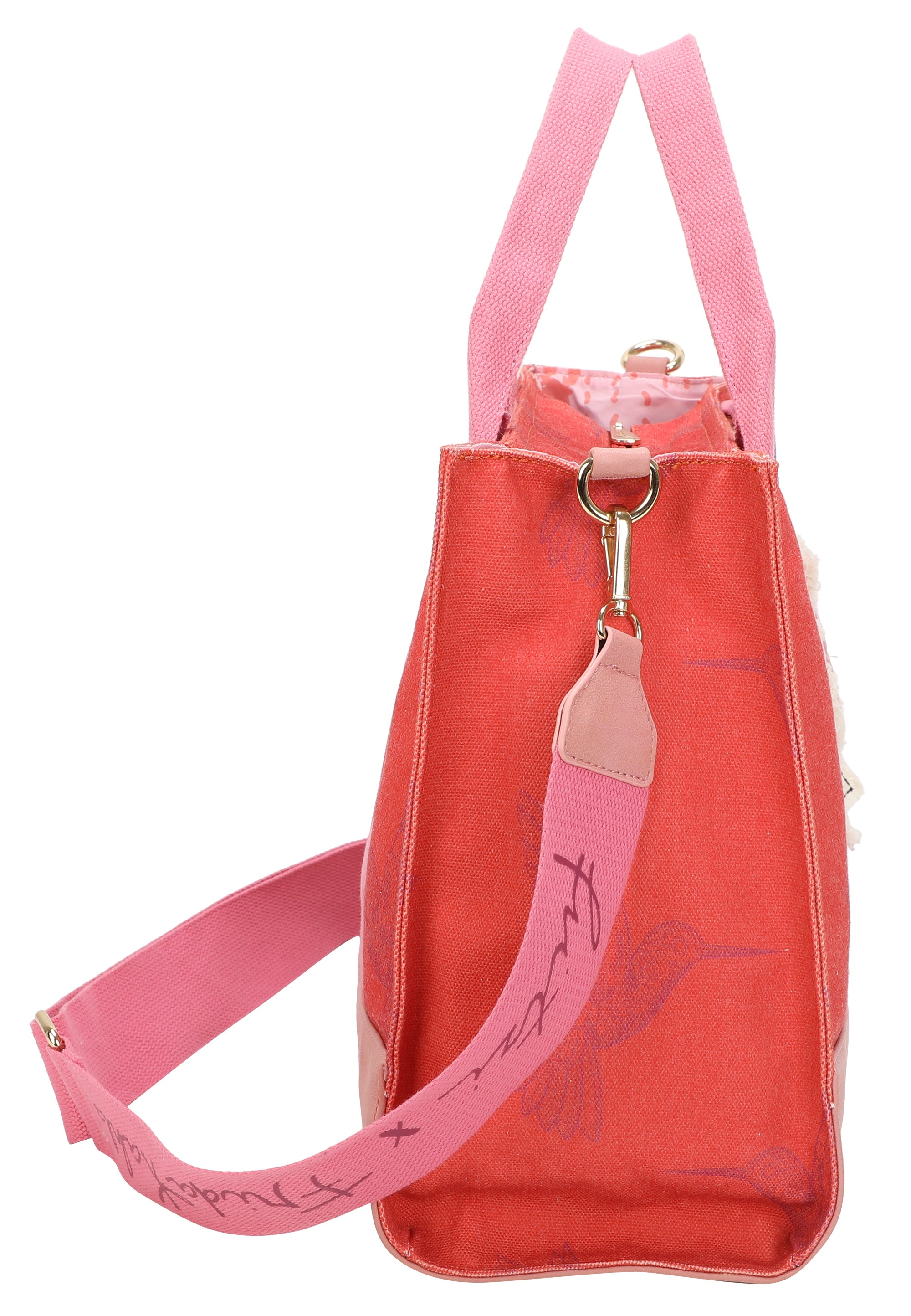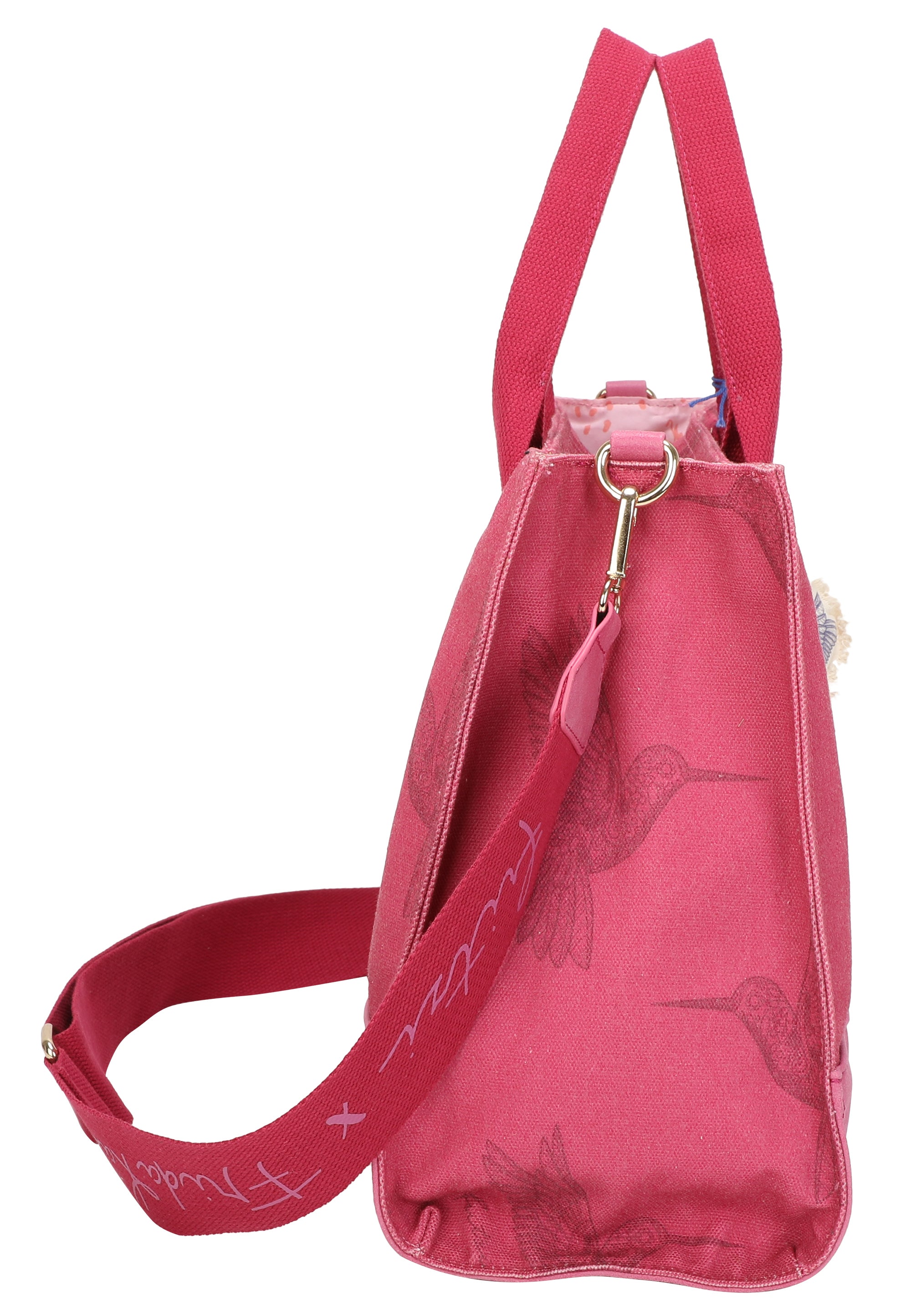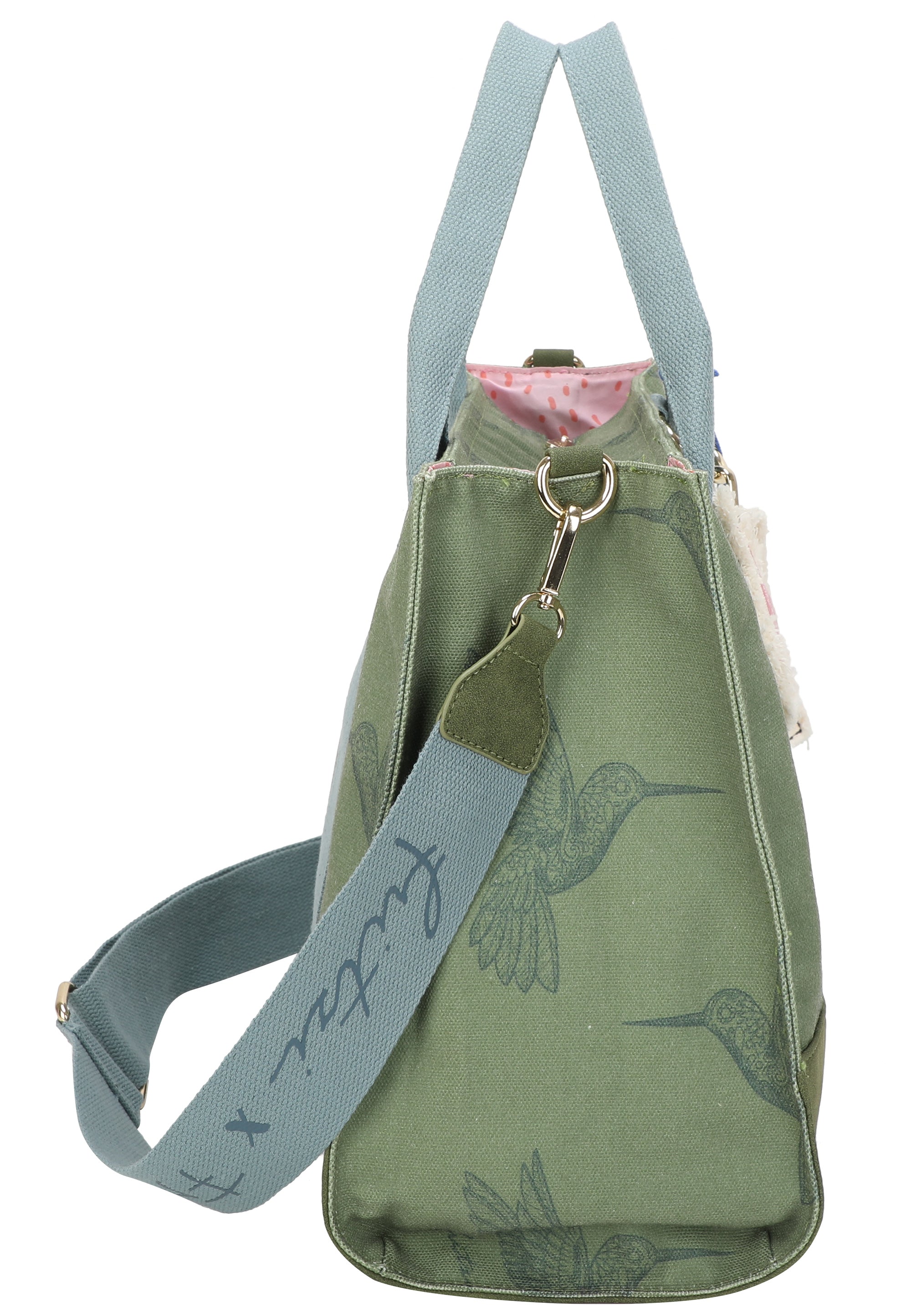 Ein abnehmbarer, leicht wattierter Canvas-Anhänger mit feinem Kolibri-Print rundet den Style harmonisch ab. Praktische Innenfächer sorgen für eine gute Organisation. Zum Style gehört auch ein extra Webbing-Schultergurt, der sich individuell auf die gewünschte Länge einstellen lässt, sowie ein kleiner Taschenanhänger, der abnehmbar ist.