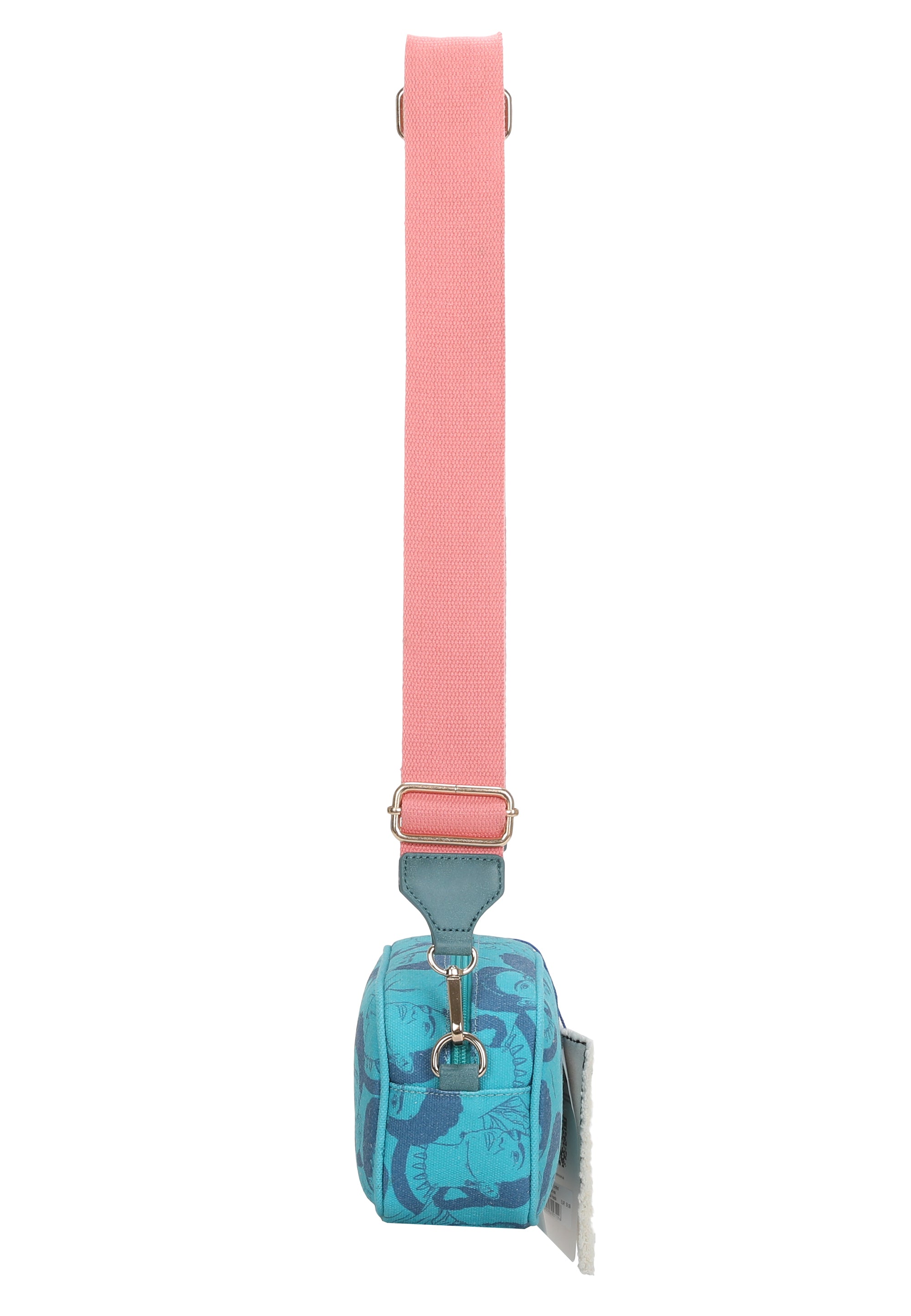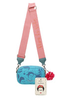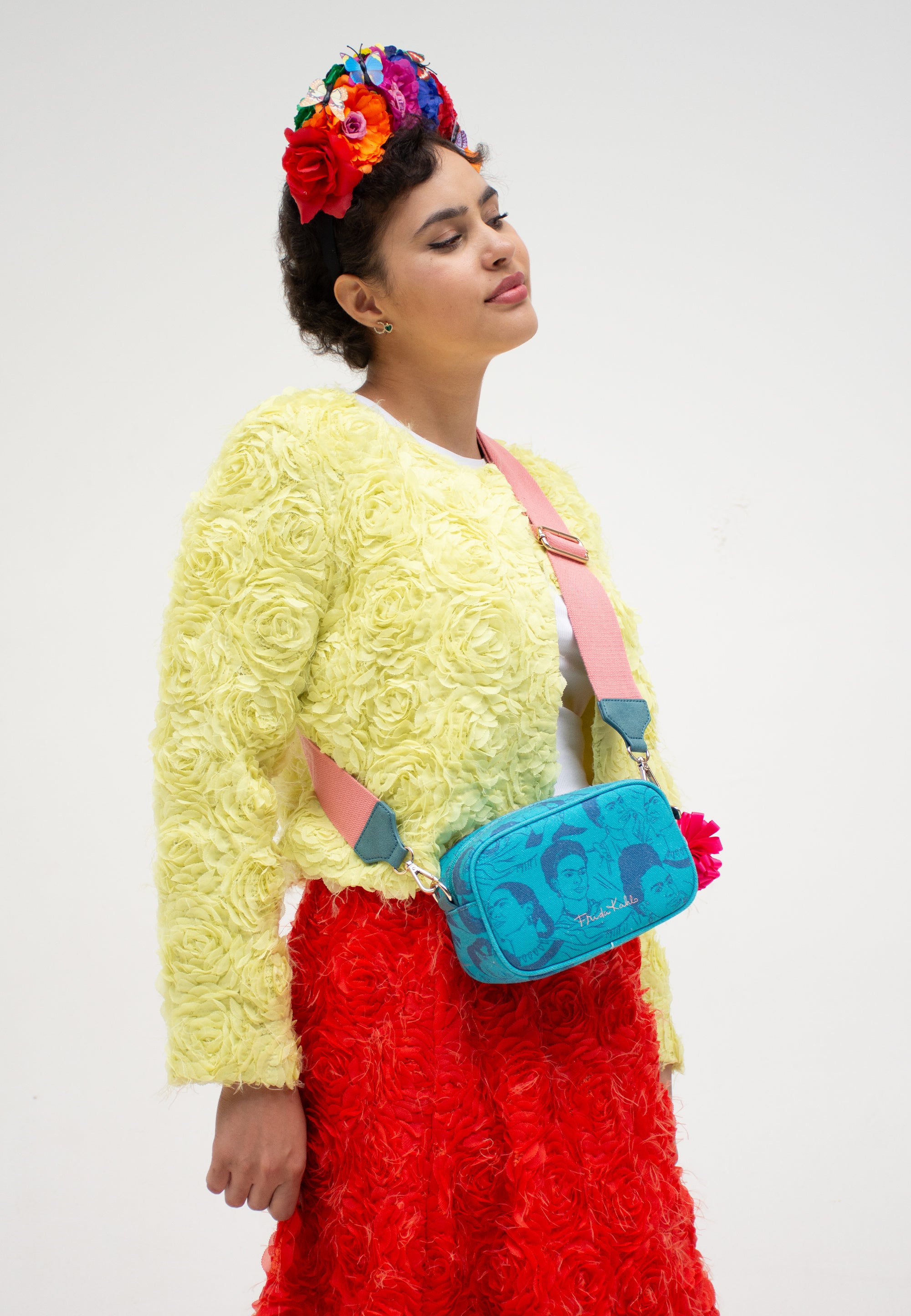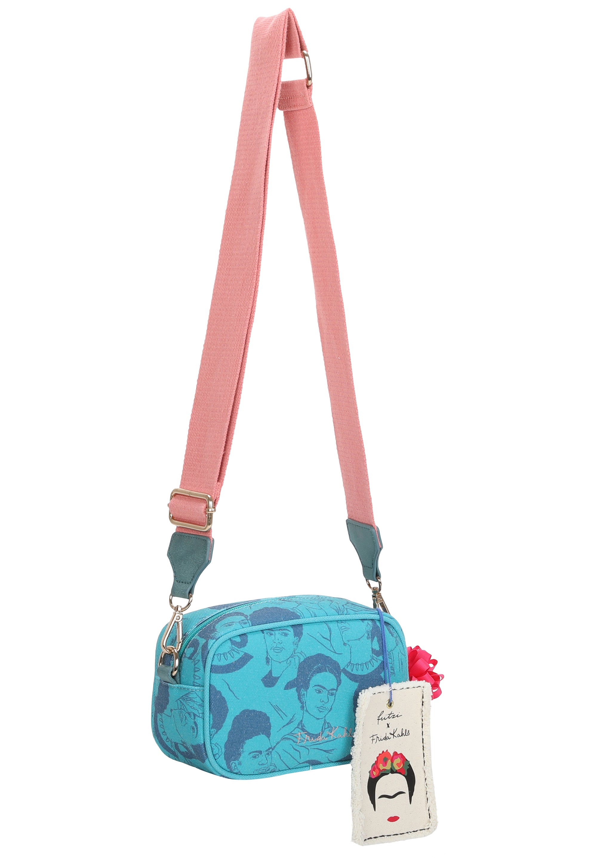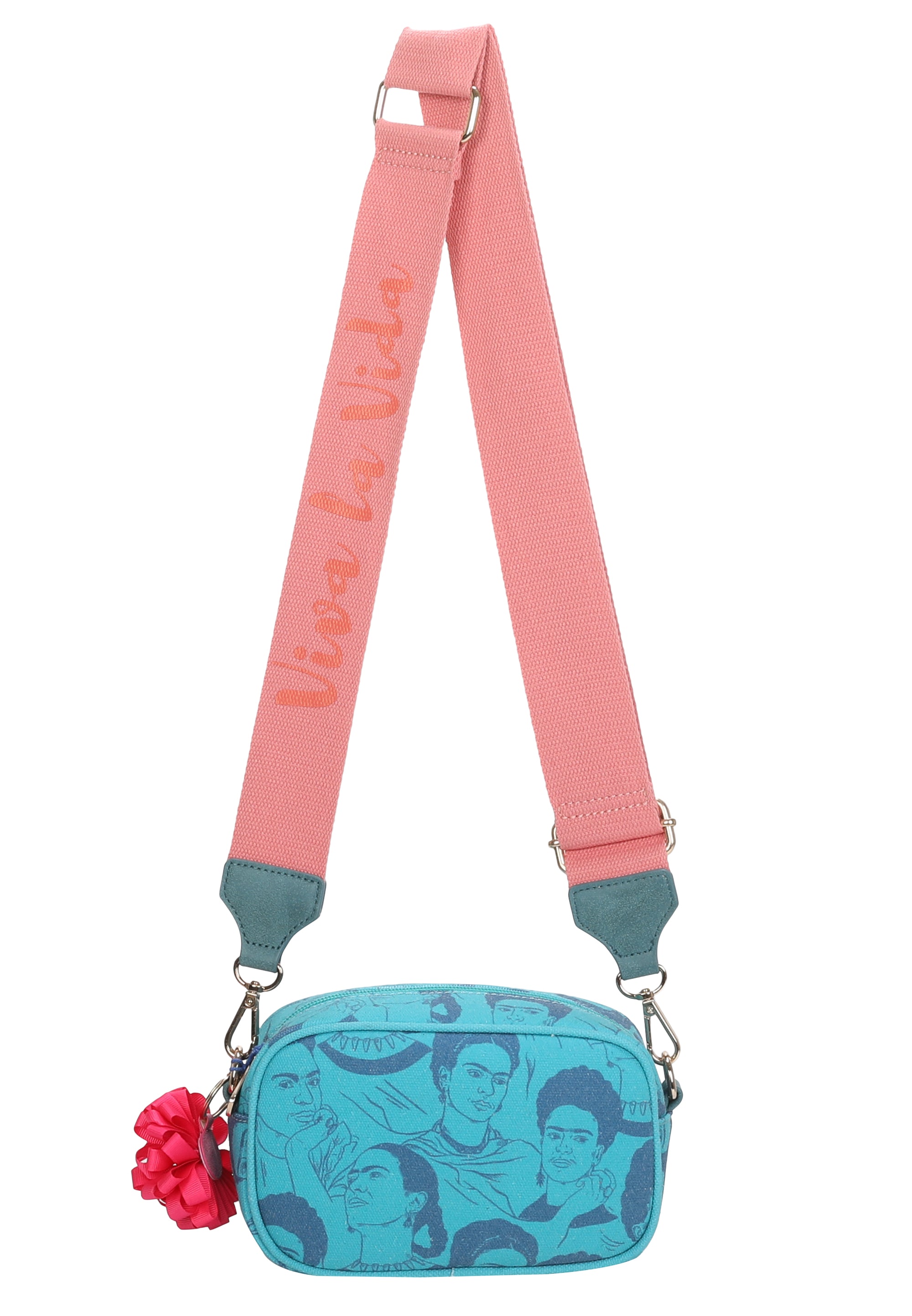 Ausgestattet ist der Style zusätzlich mit einem drapierten Blumenanhänger und mit einem schönen, handwerklichen Canvas-Anhänger mit aufgedruckter Frida Kahlo Kopf-Illustration. Der Riemen mit wunderschönem ’Viva la Vida‘-Druck ist individuell und stufenlos auf die gewünschte Länge einstellbar – ganz so wie er am besten für dich passt.