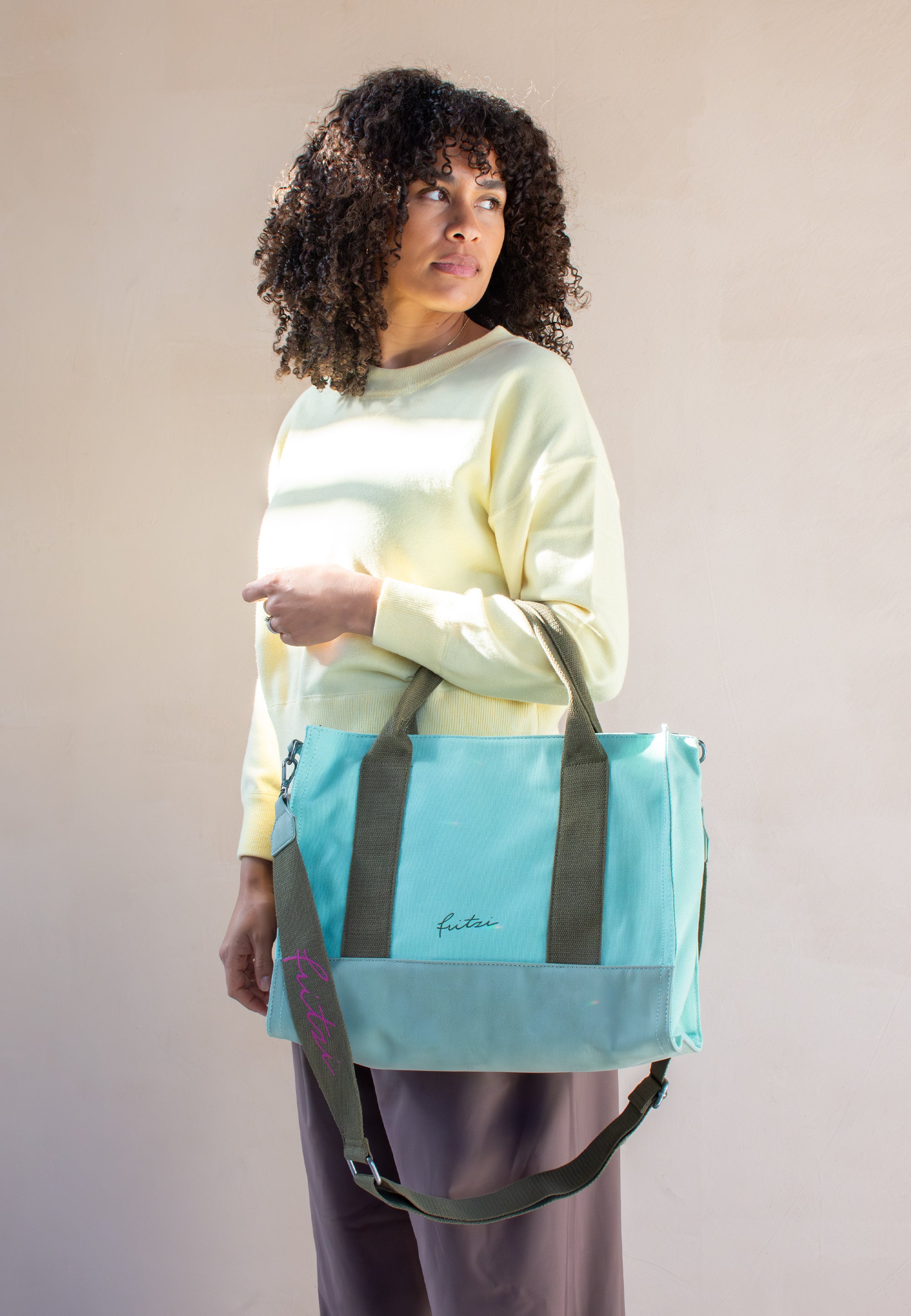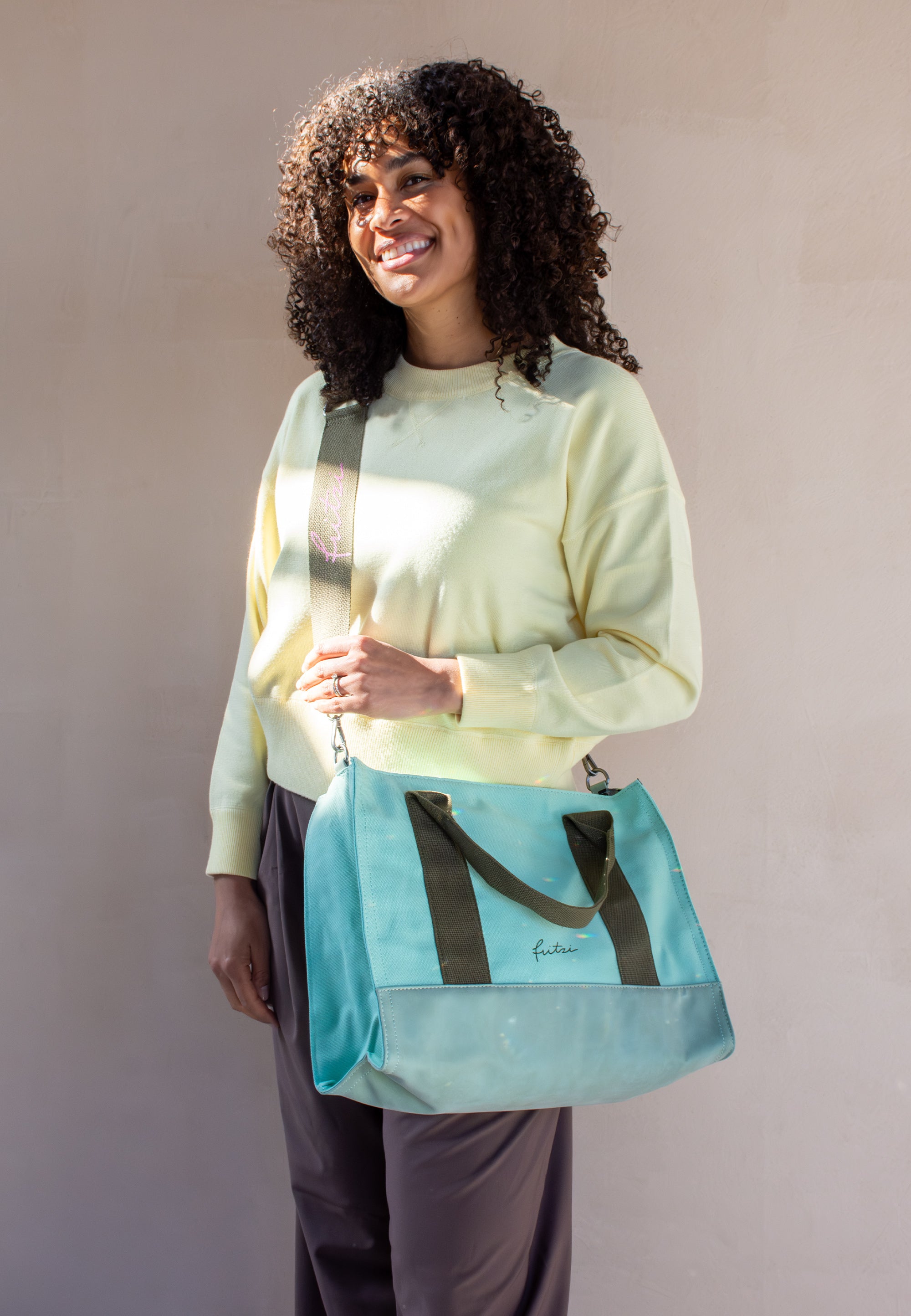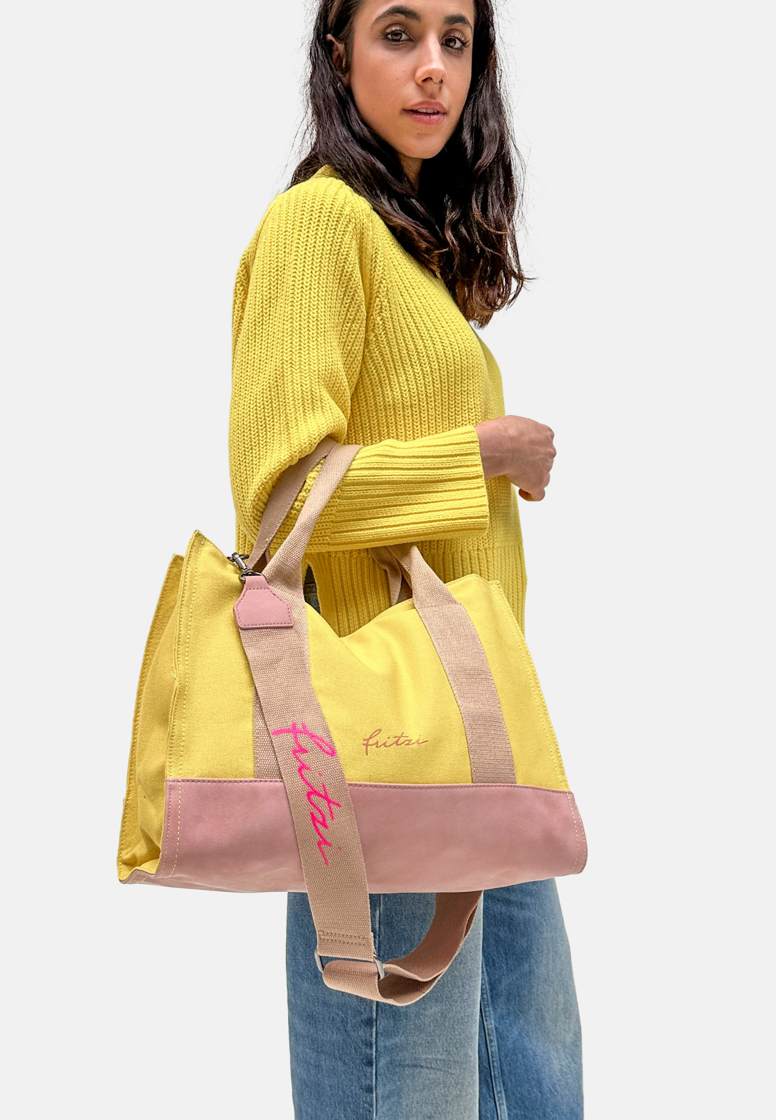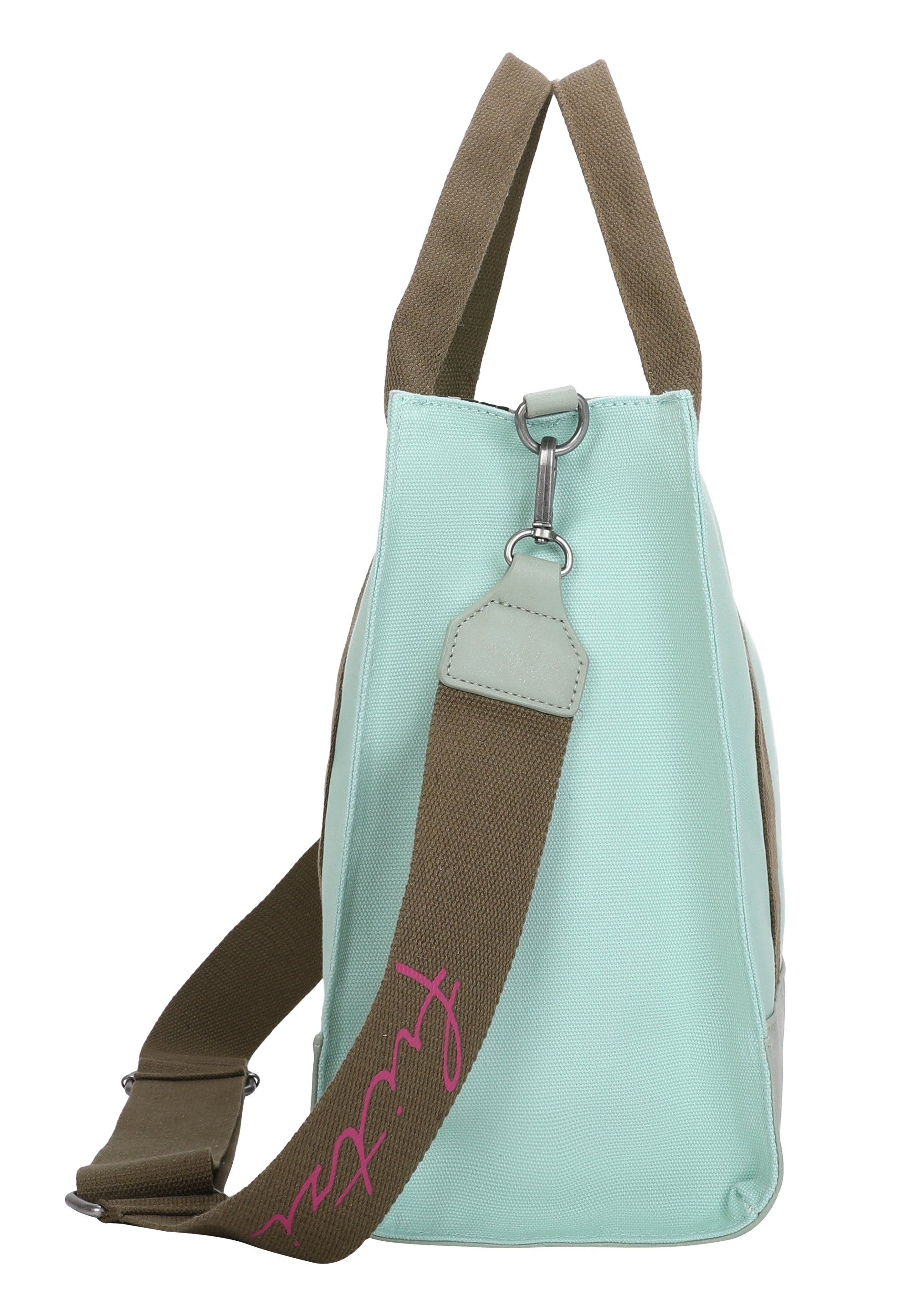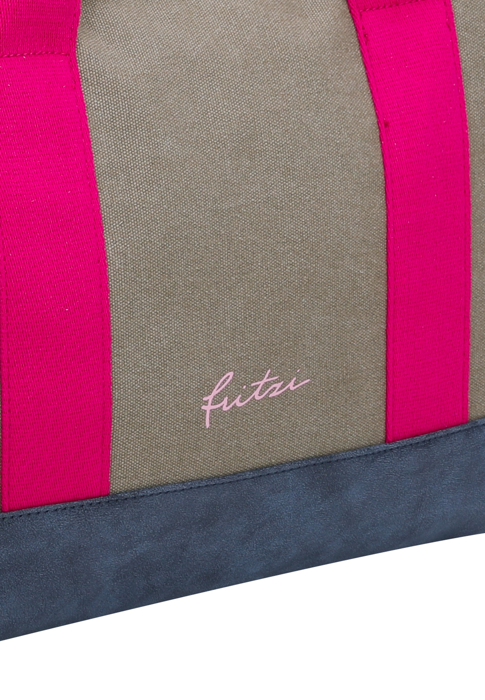 Ein abnehmbarer und verstellbarer Webbing-Schulterriemen mit ’fritzi‘-Druck passt sich farblich harmonisch an die Tasche an und bietet neben der praktischen Quertragefunktion auch optisch einen dekorativen Mehrwert.