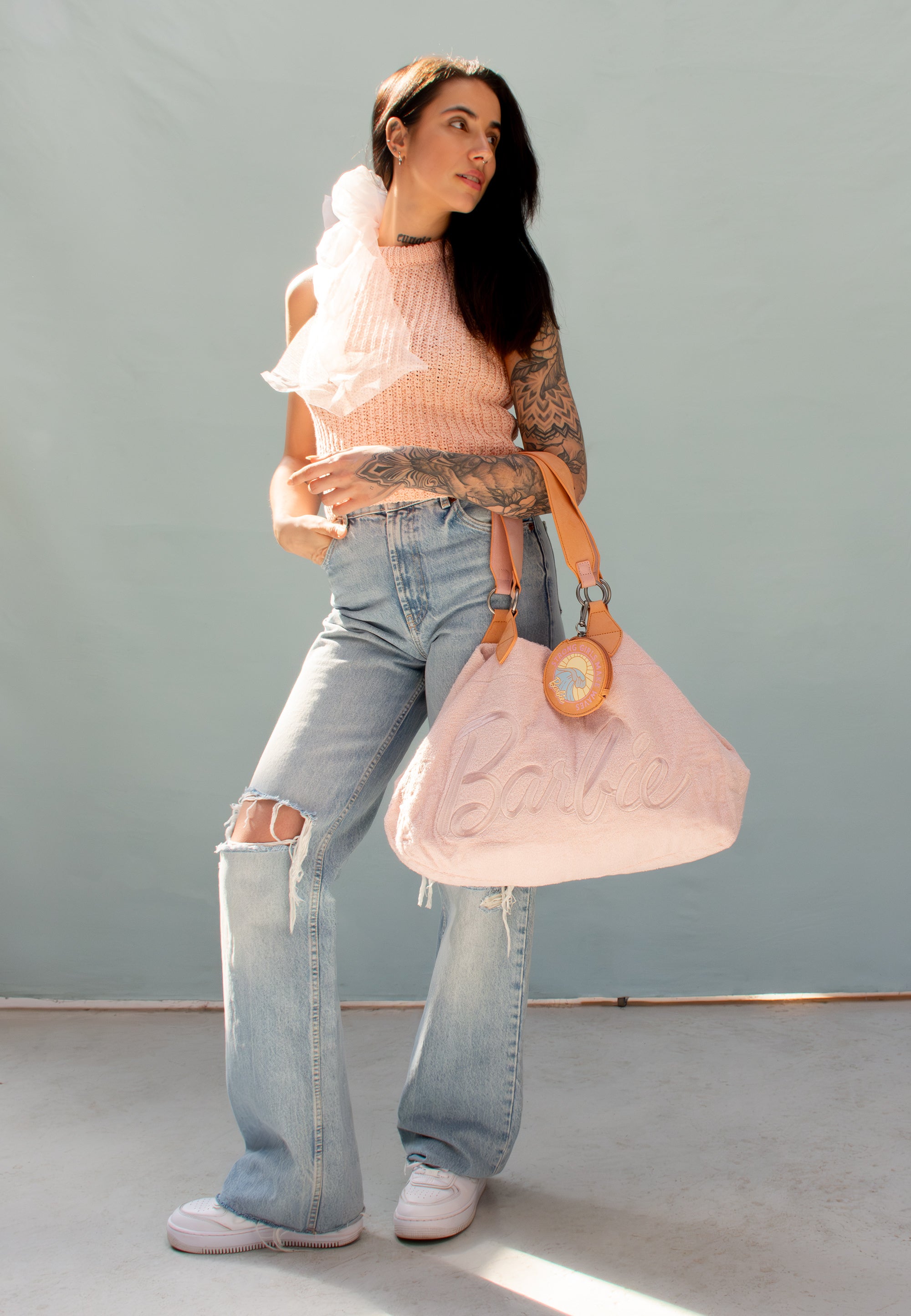 Mit einem großen, hochwertig gesticktem und tonalem Barbie Schriftzug auf der Vorderseite ist der Style für jeden Barbie Fan einfach ein absolutes Highlight – in diesen ultraweichen Beach-Look verliebst du dich einfach sofort. Abgerundet wird dieser Shopper mit einem tollem, abnehmbaren Taschen-Anhänger mit Reißverschluss und schönem Barbie Wellen-Print im Retro-Look.