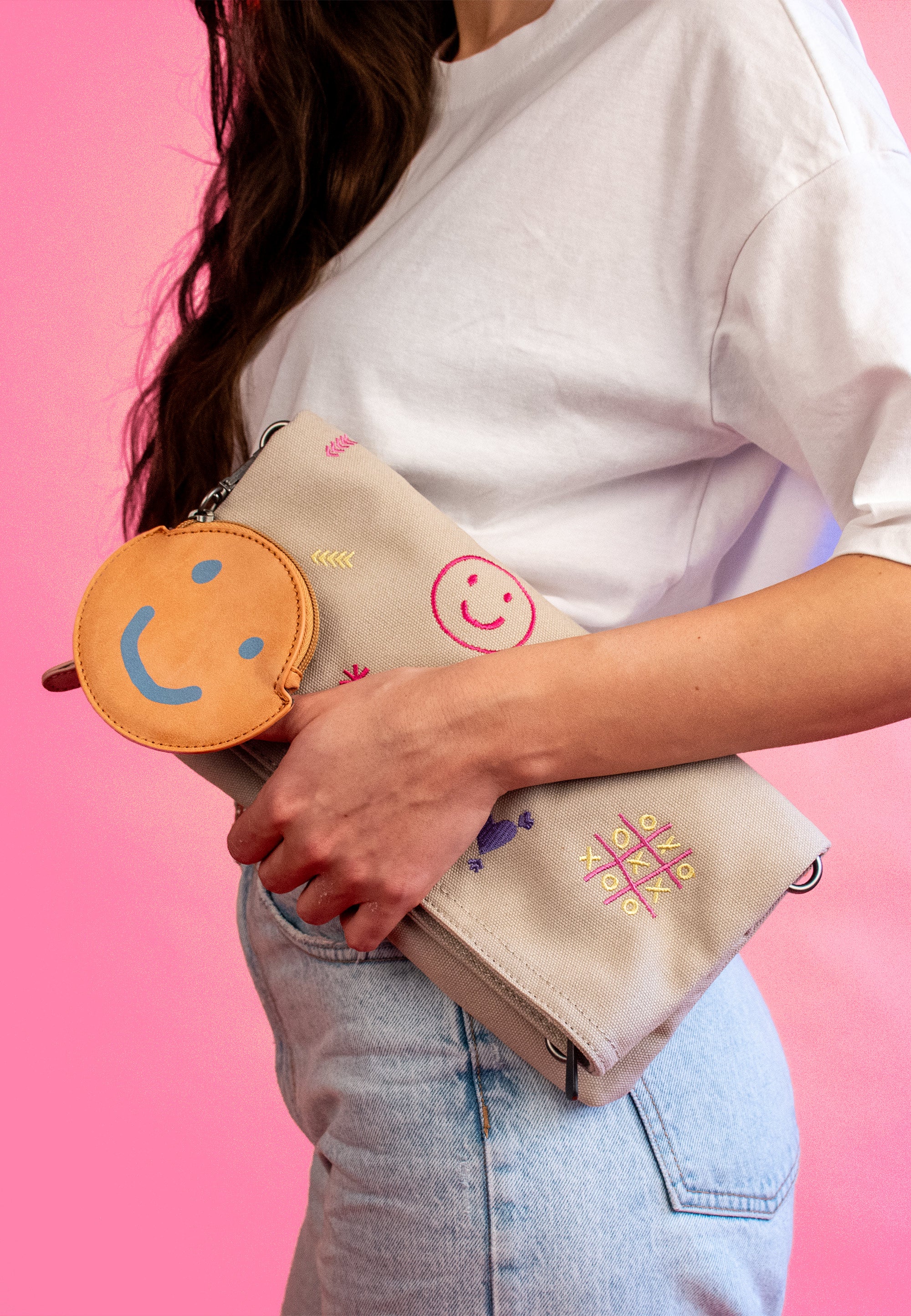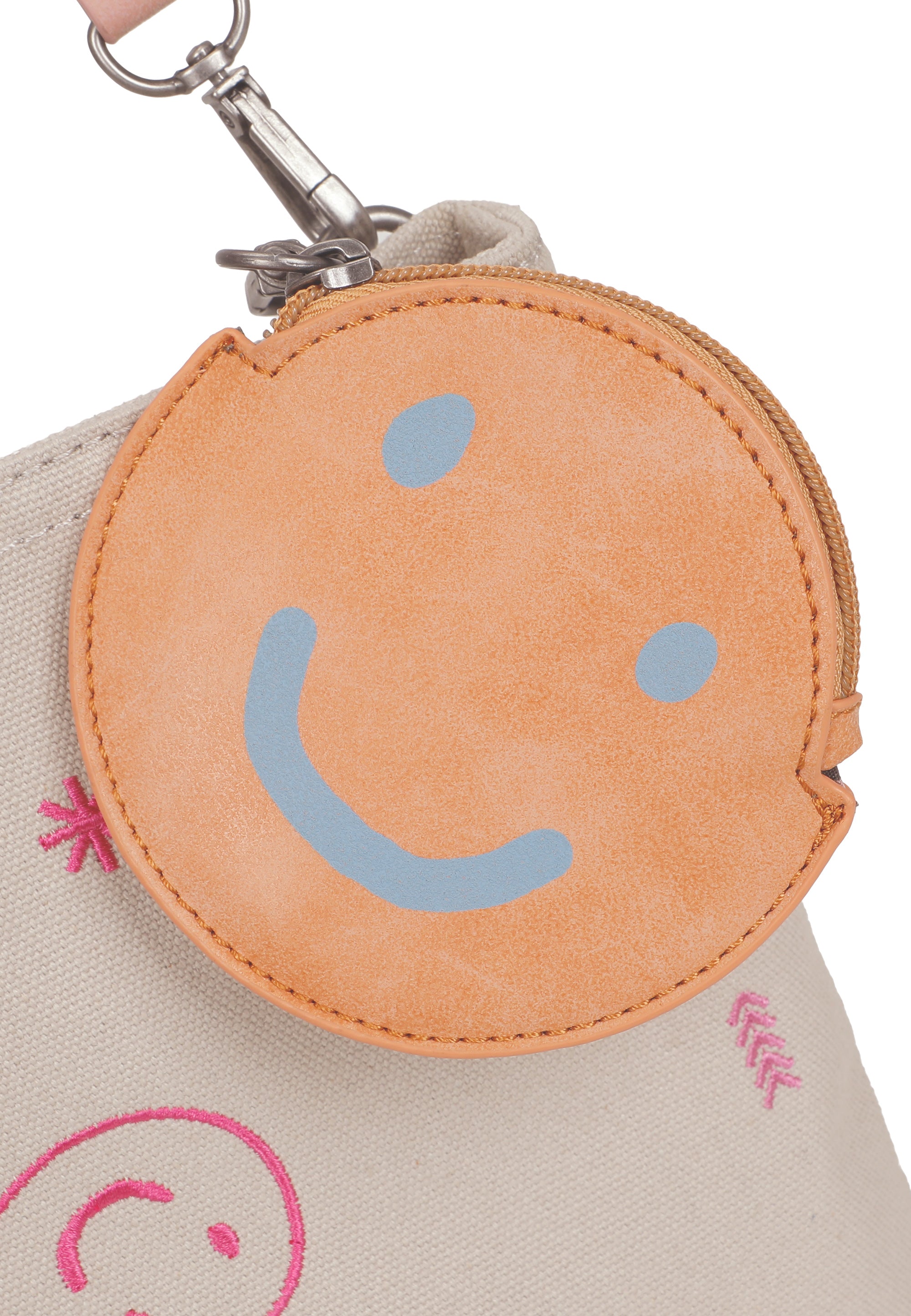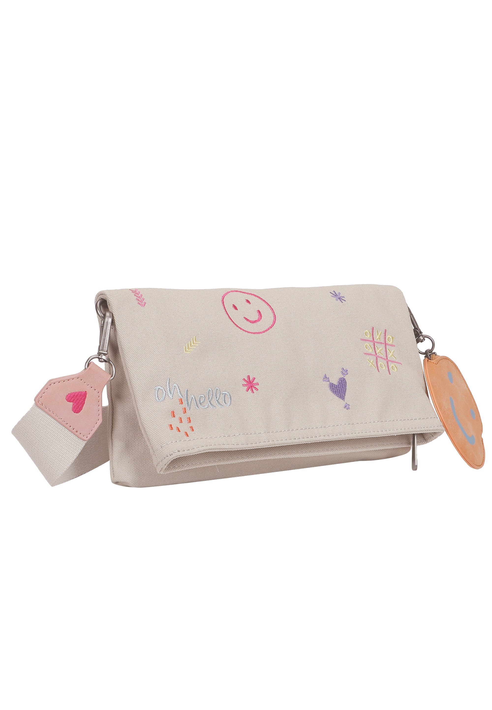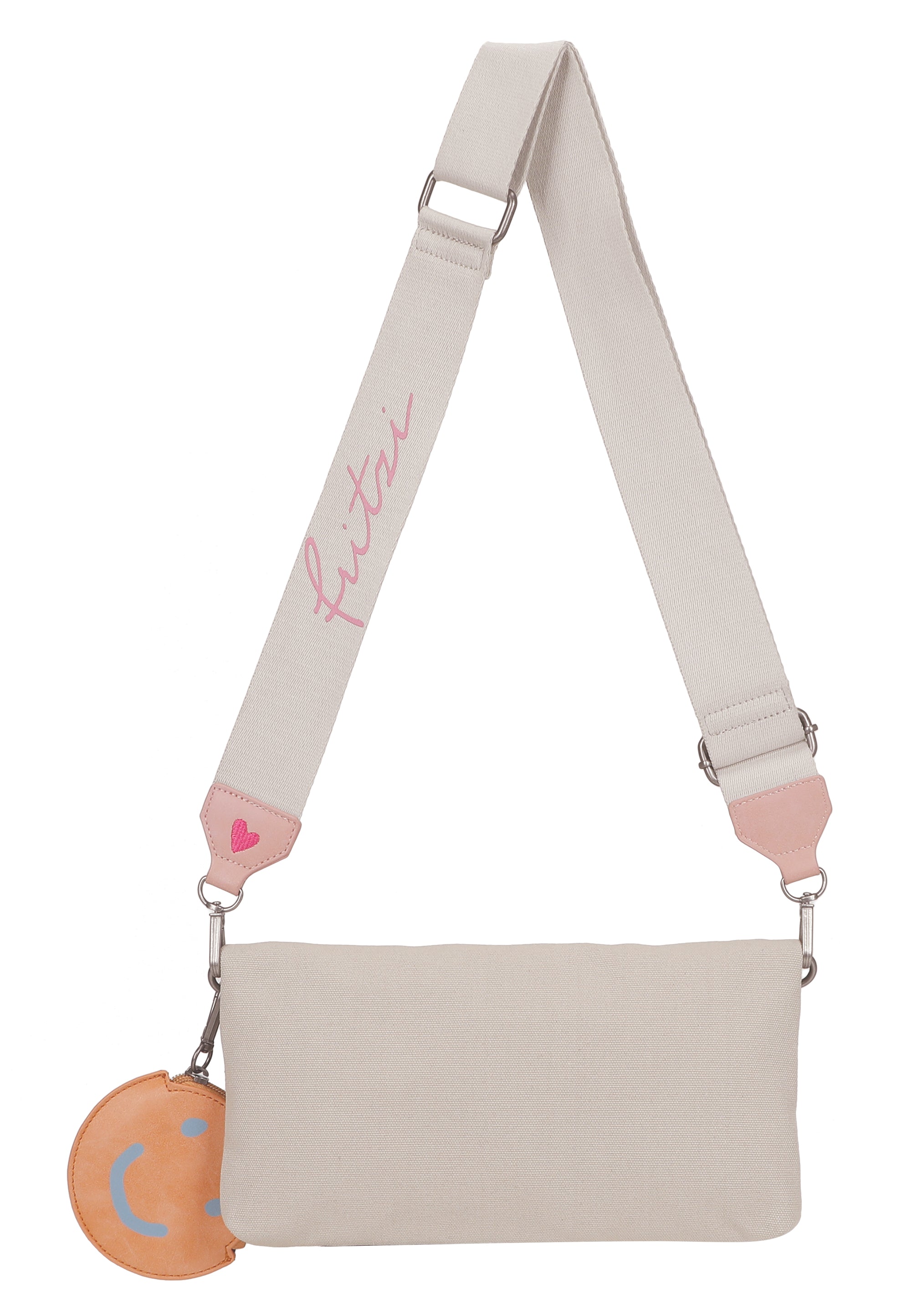 Abgerundet wird der Look mit einem kleinen, abnehmbaren Pocket-Anhänger mit Reißverschluss und süssem ’Happy-Smile-Print‘. Ob umgeklappt oder mit erweitertem Stauraum in aufgeklappter Trageoption: deine lieben Begleiter finden schnell ein sicheres Plätzchen.